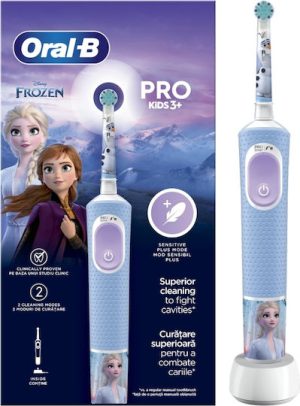 Η Oral-B Vitality Pro Kids Disney Frozen είναι ηλεκτρική παιδική οδοντόβουρτσα για ηλικίες 3+, με 2 προγράμματα βουρτσίσματος, πολύ μαλακές ίνες και χρονομετρητή 2 λεπτών. Διαθέτει στρογγυλή κεφαλή για απαλή αλλά αποτελεσματική αφαίρεση πλάκας και επαναφορτιζόμενη μπαταρία με διάρκεια έως 8 ημέρες. Περιλαμβάνει αυτοκόλλητα Frozen και υποστηρίζει την εφαρμογή Disney Magic Timer.