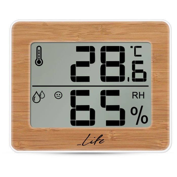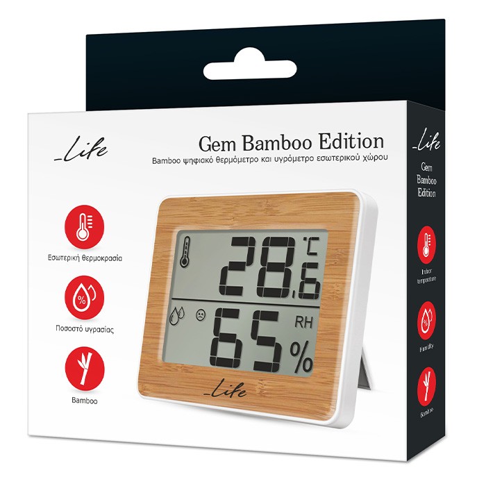 Με μεγάλη οθόνη και ευανάγνωστα ψηφία, για να παρακολουθείτε την θερμοκρασία και τα επίπεδα υγρασίας στον χώρο σας. Είναι ιδανικό για κάθε χώρο χάρη στον κομψό σχεδιασμό του και το πλαίσιο από bamboo. Μπορεί να τοποθετηθεί οπουδήποτε εσείς θέλετε στον χώρο σας, καθώς προσφέρει την δυνατότητα επιτραπέζιας ή επιτοίχιας τοποθέτησης και λειτουργεί με μπαταρίες.