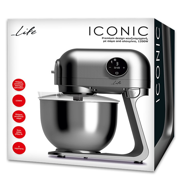 Η εμβληματική κουζινομηχανή LIFE ICONIC, με minimal design και πλήρως μεταλλική κατασκευή, θα γίνει το απόλυτο, eye-catching εργαλείο μαγειρικής στην κουζίνα σας! Διαθέτει ισχυρό μοτέρ 1200W, κατασκευασμένο από 100% χαλκό, πλήρως μεταλλικό σύστημα γραναζιών για εξαιρετική αντοχή και δύναμη και σώμα από αλουμίνιο, ορίζοντας έτσι μια κουζινομηχανή με κορυφαία ποιότητα κατασκευής και μέγιστη αντοχή στο χρόνο! Το μπόλ ανάμειξης από ανοξείδωτο ατσάλι, μέγιστης χωρητικότητας 5L, διαθέτει επιπλέον διαφανές αποσπώμενο καπάκι για προστασία από πιτσιλιές και πρακτικό άνοιγμα συμπλήρωσης υλικών κατά την διάρκεια της λειτουργίας. Η LIFE ICONIC διαθέτει οθόνη αφής από την οποία ορίζετε μία από τις 6 ταχύτητες λειτουργίας και μπορείτε να ρυθμίσετε την λειτουργία του χρονοδιακόπτη από 1 έως 10 λεπτά, για αυτόματη απενεργοποίηση σε όλες τις ταχύτητες λειτουργίας. Είναι εξοπλισμένη με τρία εξαρτήματα για να επιλέγετε ανάλογα με τα υλικά και την συνταγή σας: γάντζο ανάμιξης από αλουμίνιο, γάντζο ζυμώματος και αυγοδάρτη από ανοξείδωτο ατσάλι. Με την πλανητική κίνηση των αναδευτήρων και με την σταθερή ταχύτητα ανάμιξης που προσφέρει, θα έχετε γρήγορα και τέλεια αποτελέσματα ακόμα και σε βαριές ζύμες! Το ασφαλές κλείδωμα του κάδου, το πλήκτρο απασφάλισης βραχίονα και τα ποδαράκια με βεντούζες προσφέρουν εξαιρετική σταθερότητα κατά την λειτουργία της συσκευής. Τέλος, διαθέτει λειτουργία αυτόματης απενεργοποίησης όταν σηκωθεί η κεφαλή κατά τη λειτουργία για μέγιστη ασφάλεια!