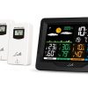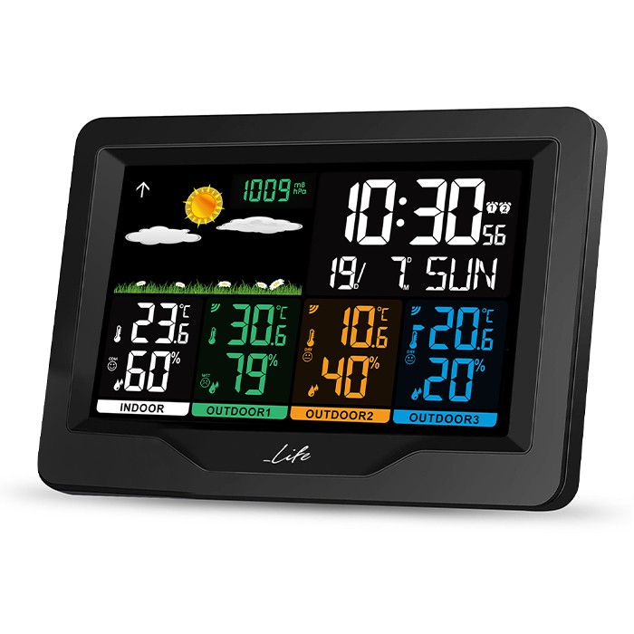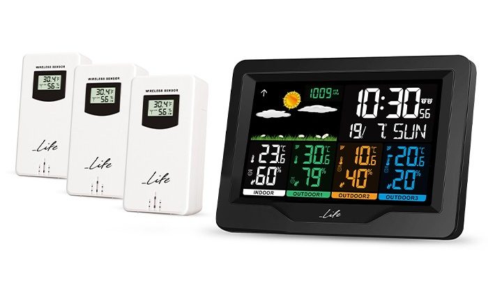 Μετεωρολογικός σταθμός με 3 ασύρματους εξωτερικούς αισθητήρες, έγχρωμη οθόνη LCD 5.9″ και ρολόι / ξυπνητήρι. Μετεωρολογικός σταθμός με μεγάλη, έγχρωμη ψηφιακή LCD οθόνη 5.9″, και 3 ασύρματους εξωτερικούς αισθητήρες για πλήρη ενημέρωση της θερμοκρασίας και της υγρασίας σε 3 διαφορετικά εξωτερικά σημεία! Μπορείτε κάλλιστα να τοποθετήσετε τον έναν αισθητήρα σε εξωτερικό χώρο και τους άλλους δύο αισθητήρες σε διαφορετικά δωμάτια του σπιτιού, ώστε να έχετε πλήρη εικόνα της θερμοκρασίας και της υγρασίας σε δωμάτια που θέλετε να παρακολουθείτε (π.χ. στο παιδικό δωμάτιο, στο γκαράζ κτλ). Με design σε απλές γραμμές και οθόνη εντυπωσιακών χρωμάτων είναι κατάλληλο για κάθε χώρο, ενώ παράλληλα η λειτουργία ρολογιού / ξυπνητηριού το κάνει σχεδόν απαραίτητο στην κρεβατοκάμαρά σας.