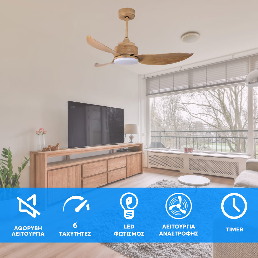 Ο Telemax Levantes 46-YJ356 διαθέτει ρυθμιζόμενo φωτισμό LED 24W, με δυνατότητα επιλογής ανάμεσα σε τρεις θερμοκρασίες φωτός ( θερμό, ουδέτερο και ψυχρό ) και 7 επίπεδα έντασης φωτισμού για να προσαρμόζεται στις ανάγκες και τη διάθεση του χρήστη. Το τηλεχειριστήριο που περιλαμβάνεται, προσφέρει ευκολία στη χρήση, επιτρέποντάς σας να ελέγχετε τις λειτουργίες του ανεμιστήρα από απόσταση. Με 6 επίπεδα ταχύτητας, μπορείτε να ρυθμίσετε την ένταση του αέρα ανάλογα με τις προτιμήσεις σας, ενώ η λειτουργία αντιστροφής εξασφαλίζει την ανακύκλωση του ζεστού αέρα τον χειμώνα, καθιστώντας τον ανεμιστήρα κατάλληλο για χρήση όλο τον χρόνο.