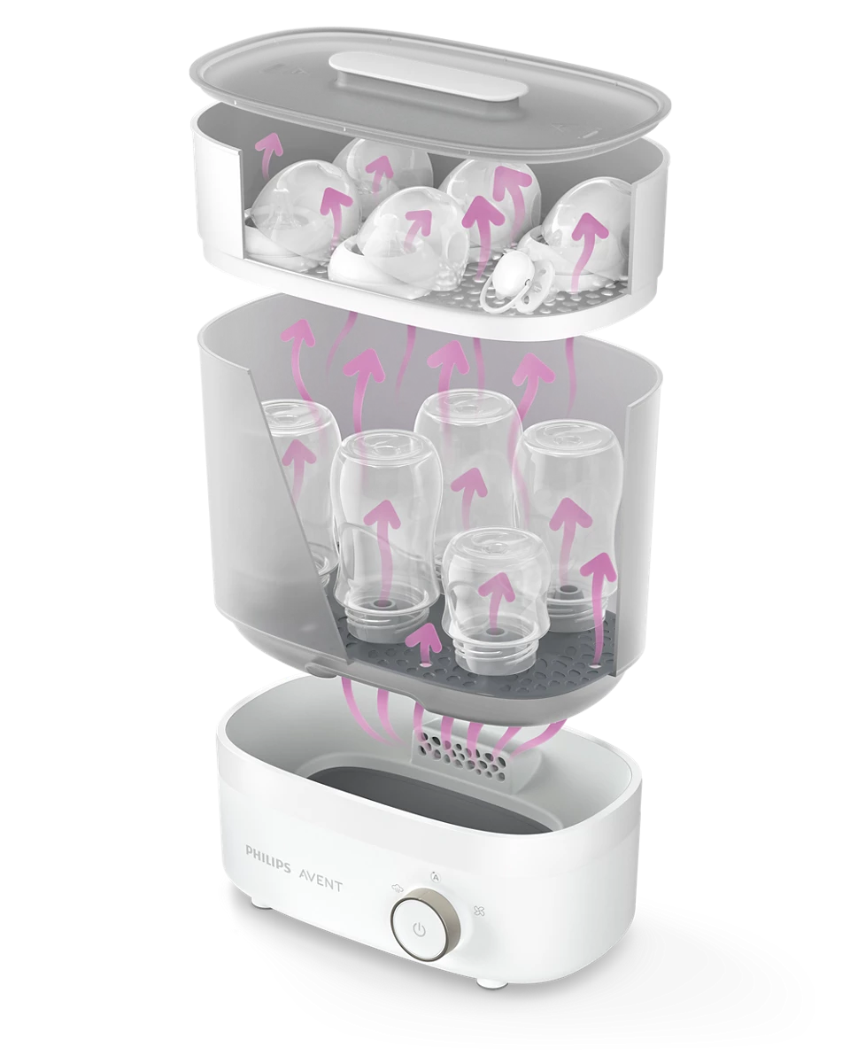 Προετοιμαστείτε για το επόμενο τάισμα του μωρού σας σε 40 λεπτά. Ο αποστειρωτής και στεγνωτήρας μπιμπερό Premium χρησιμοποιεί πίδακες φιλτραρισμένου αέρα για να στεγνώνει τα μπιμπερό προτού απενεργοποιηθεί. Ο αποστειρωτής εξασφαλίζει γρήγορη και υγιεινή αποστείρωση, καθώς εξουδετερώνει το 99,9% των βλαβερών μικροβίων* για να είστε ήσυχοι σε κάθε τάισμα.