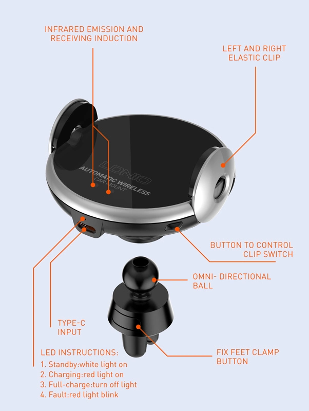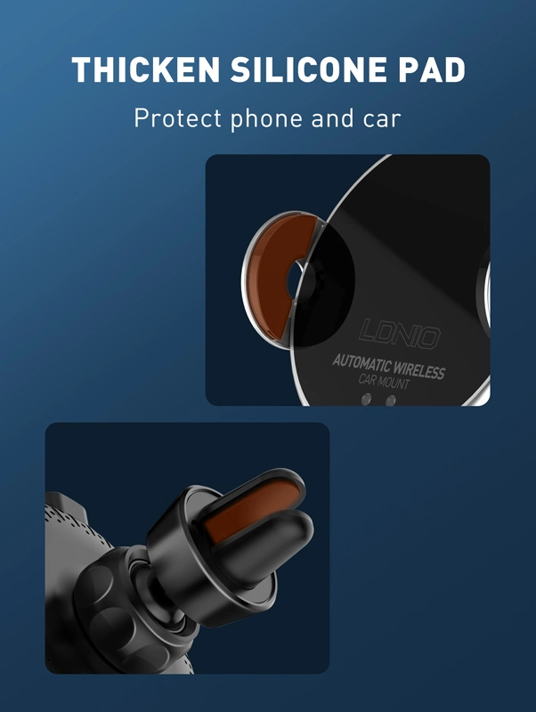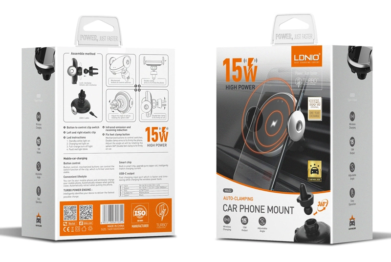 Ασύρματος φορτιστής και βάση αυτοκινήτου της LDNIO με στήριξη σε οριζόντιους ή κάθετους αεραγωγούς του αυτοκινήτου. Συγκρατεί το smartphone σταθερό και ασφαλές με κλιπ συγκράτησης ενώ παράλληλα το φορτίζει ασύρματα με απόδοση έως 15W. Η δέσμευση της συσκευής γίνεται αυτόματα και τα πτερύγια που ασφαλίζεται το smartphone είναι επενδυμένα από αντιολισθητικό, μαλακό υλικό, που βελτιώνει το επίπεδο συγκράτησης της συσκευής, αποτρέποντας παράλληλα τις γρατσουνιές από την χρήση. Για την λειτουργία του απαιτείται τροφοδοσία μέσω καλωδίου USB (συμπεριλαμβάνεται).