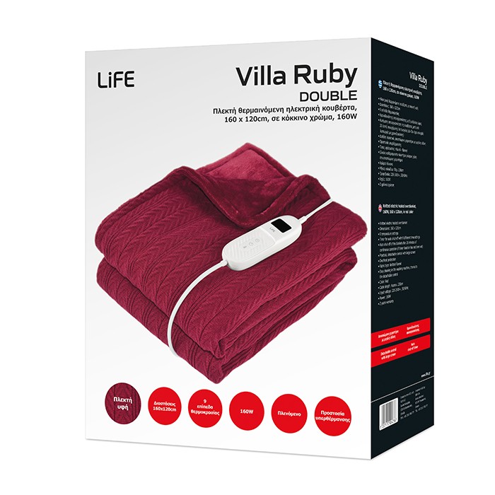 Η ηλεκτρική θερμαινόμενη κουβέρτα LiFE VILLA RUBY προσφέρει άνεση και ζεστασιά, είτε ξαπλώνετε στο κρεβάτι είτε απλά χαλαρώνετε στον καναπέ σας. Η μία της πλευρά είναι από μαλακό flannel fleece -σε βαθύ κόκκινο χρώμα – για αξεπέραστα μαλακή αίσθηση και ζεστασιά και η άλλη της πλευρά είναι πλεκτή -επίσης σε βαθυ κόκκινο χρώμα- δίνοντας έτσι έναν αέρα πολυτέλειας στον χώρο σας, αφού μπορείτε να την διακοσμήσετε είτε στο κρεβάτι σας είτε στον καναπέ σας. Διαθέτει 9 επίπεδα θερμοκρασίας για την επιλογή της ιδανικής θερμοκρασίας ανάλογα με τις δικές σας ανάγκες. Επιπλέον, μπορείτε να χρησιμοποιήσετε τον χρονοδιακόπτη απενεργοποίησης με 9 διαφορετικές ρυθμίσεις ώρας προκειμένου να προγραμματίσετε μόνοι σας την επιθυμητή ώρα απενεργοποίησης. Εάν δεν έχει επιλεχθεί ο προτιμώμενος χρόνος λειτουργίας, η κουβέρτα απενεργοποιείται αυτόματα έπειτα από 20 λεπτά συνεχόμενης λειτουργίας για μέγιστη ασφάλεια. Διαθέτει όμορφο και πρακτικό χειριστήριο με μεγάλο μήκος και μεγάλη, ευδιάκριτη οθόνη, ενώ ο αποσπώμενος σχεδιασμός του χειριστηρίου, καθιστά εύκολο το καθάρισμά της ακόμα και στο πλυντήριο ρούχων.