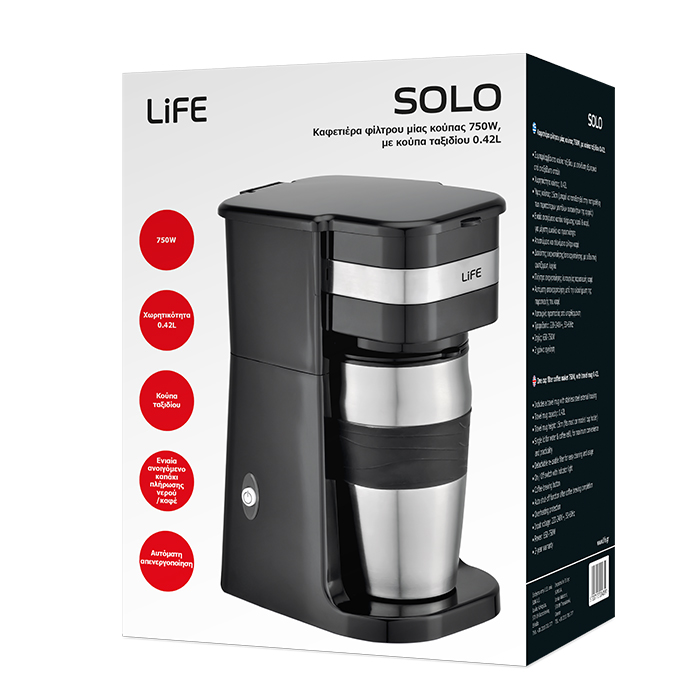 Η LiFE SOLO είναι μία πρακτική καφετιέρα φίλτρου μίας κούπας, με ισχύ 750W, κι έρχεται με μια ποιοτική κούπα ταξιδίου με εξωτερική επένδυση από ανοξείδωτο ατσάλι. Με τη LiFE SOLO, ετοιμάζετε τον δικό σας καφέ φίλτρου και χάρη στην κούπα ταξιδίου, μπορείτε να τον πάρετε μαζί σας στο ταξίδι ή στην καθημερινή σας μετακίνηση προς τη δουλειά. Η κούπα έχει χωρητικότητα 0,42L, ύψος 15cm, και ταιριάζει στις ποτηροθήκες των περισσότερων μοντέλων αυτοκινήτων της αγοράς. Είναι πολύ εύκολη στο καθάρισμα χάρη στο αποσπώμενο και πλενόμενο φίλτρο καφέ, ενώ το ενιαία ανοιγόμενο καπάκι για να γεμίζετε νερό και καφέ, σας δίνει την πρακτικότητα που πάντα θέλετε από μία καφετιέρα φίλτρου. Διαθέτει διακόπτη ενεργοποίησης/απενεργοποίησης, με ενδεικτική φωτιζόμενη λυχνία και πλήκτρο ενεργοποίησης λειτουργίας παρασκευής καφέ. Τέλος, η LiFE SOLO διαθέτει προστασία από υπερθέρμανση, για μέγιστη ασφάλεια στη χρήση της.