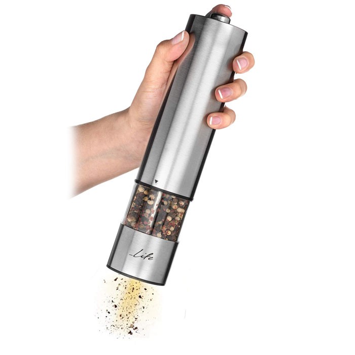 Ο ηλεκτρικός τρίφτης LIFE S&P είναι το ιδανικό εργαλείο στην κουζίνα σας για να έχετε πάντα φρεσκοτριμμένο αλάτι και πιπέρι στο πιάτο σας! Κάντε το φαγητό σας γευστικότερο επιλέγοντας μεταξύ χοντρού ή ψιλοτριμμένου αλατιού, χάρη στο ρυθμιζόμενο επίπεδο τριψίματος που διαθέτει ο ηλεκτρικός μύλος LIFE. Επιπλέον διαθέτει λυχνία φωτισμού LED, για να ελέγχετε καλύτερα την δοσολογία των καρυκευμάτων που προσθέτετε! Ο S&P έχει περίβλημα από ανοξείδωτο ατσάλι υψηλής ποιότητας και διαθέτει κεραμικό μηχανισμό άλεσης. Ο ηλεκτρικός τρίφτης είναι σχεδιασμένος με τέτοιο τρόπο ώστε να μπορείτε να τον χρησιμοποιείτε με το ένα χέρι για μεγαλύτερη άνεση και ευκολία. Επίσης έχει διαφανές δοχείο για τα μπαχαρικά, που σας δίνει τη δυνατότητα να ελέγχετε την ποσότητα των μπαχαρικών που έχει μέσα. Τέλος ο ηλεκτρικός μύλος διαθέτει σύστημα κλειδώματος, για ασφάλεια κατά την χρήση και λειτουργεί με 4 μπαταρίες AA 1.5V (δεν συμπεριλαμβάνονται).