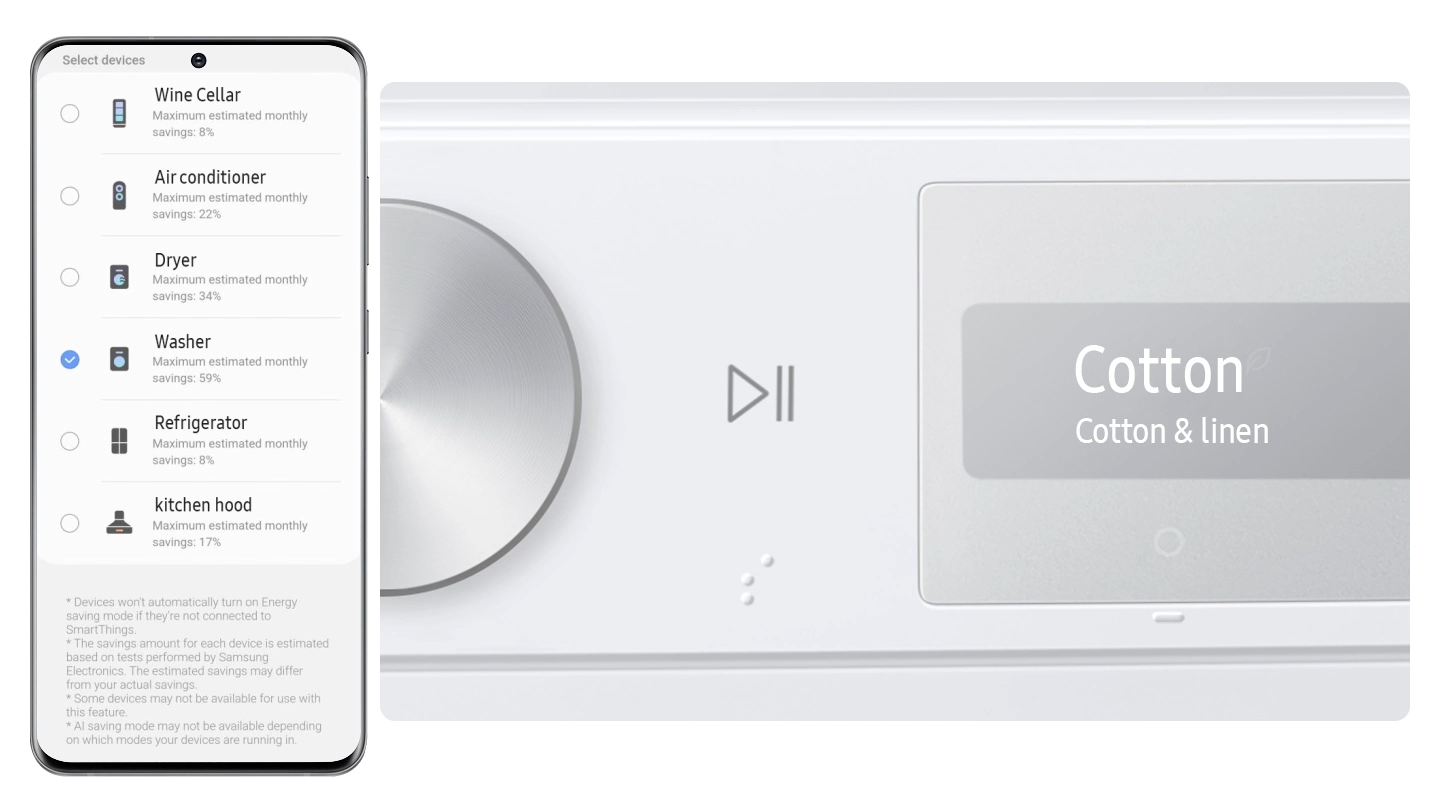 Παρακολουθήστε και προσαρμόστε εύκολα τη χρήση ενέργειας με το SmartThings AI Energy Mode. Η λειτουργία AI Energy mode* σας επιτρέπει να ελέγχετε εύκολα την κατανάλωση ενέργειας. Για τους κύκλους που λειτουργούν σε AI Energy mode** μειώνει τη χρήση ενέργειας έως και 70%*** χρησιμοποιώντας το EcoBubble™ για πλύση με κρύο νερό αντί για ζεστό νερό και επιπλέον χρόνο κύκλου