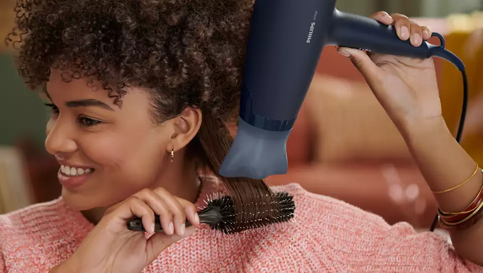 Το μοναδικά σχεδιασμένο εξάρτημα ThermoProtect συνδυάζει ζεστό και κρύο αέρα για καθημερινή φροντίδα με ισχυρό αποτέλεσμα. Η θερμοκρασία μειώνεται κατά 15°C, ενώ τα μαλλιά σας στεγνώνουν και πάλι γρήγορα.