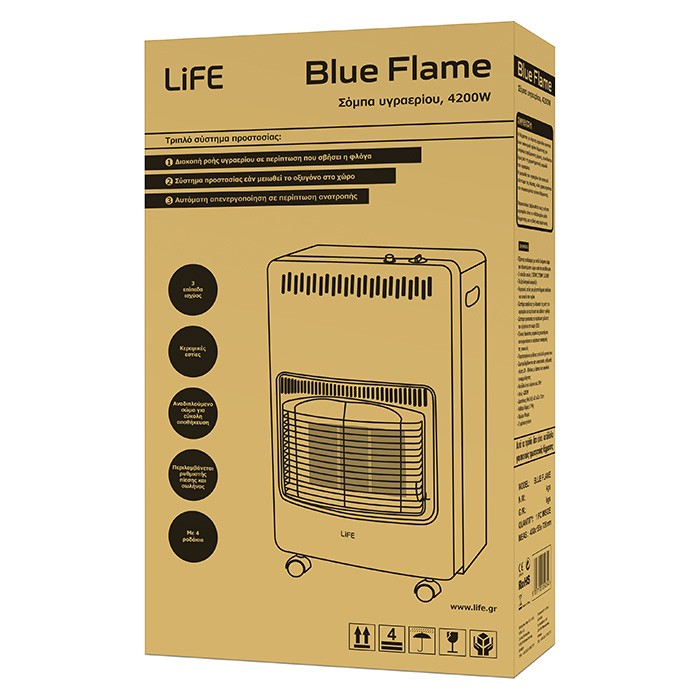 Η σόμπα υγραερίου LiFE BLUE FLAME αποτελεί την ιδανική επιλογή για μία συμπληρωματική οικονομική και αποτελεσματική θέρμανση του χώρου σας, με υγραέριο. Διαθέτει 3 επίπεδα ισχύος (1500W 2750W 4200W), πιεζοηλεκτρική ανάφλεξη και κεραμικές πλάκες μεγάλης θερμικής απόδοσης, για μέγιστη απόδοση και εξοικονόμηση ενέργειας. Ζεστάνετε τον χώρο σας με ασφάλεια χάρη στο σύστημα ασφάλειας για διακοπή της ροής του υγραερίου σε περίπτωση που σβήσει η φλόγα και το σύστημα προστασίας σε περίπτωση μείωσης του οξυγόνου στο χώρο (ODS). Επιπλέον διαθέτει ειδικό διακόπτη ασφαλείας για αυτόματη απενεργοποίηση σε περίπτωση ανατροπής της συσκευής. Με συνολική ισχύ 4200W μπορεί να ζεστάνει χώρους έως και 35τ.μ. Στη συσκευασία συμπεριλαμβάνονται ρυθμιστής πίεσης 28 – 30mbar με λάστιχο και σφικτήρες, καθώς και εργαλεία συναρμολόγησης. Η LiFE BLUE FLAME διαθέτει περιστρεφόμενα ροδάκια που κάνουν πανεύκολη τη μετακίνηση της σε όλους τους χώρους του σπιτιού! Επίσης, διαθέτει έξυπνο σχεδιασμό με αναδιπλούμενο σώμα για εξοικονόμηση χώρου κατά την αποθήκευση. Έτσι, στο τέλος της σεζόν, απλά ξεβιδώνετε μερικές βίδες και ο όγκος της μειώνεται στο ένα τρίτο, καθιστώντας την αποθήκευσή της μια πολύ εύκολη υπόθεση. Ταυτόχρονα, όταν συναρμολογηθούν τα πτυσόμενα μέρη, είναι εξαιρετικά στιβαρή κι ανθεκτική. Σημείωση: Η θέρμανση με σόμπες υγραερίου αποτελεί έναν οικονομικό τρόπο θέρμανσης για επαρκώς αεριζόμενους χώρους, συνοδεύεται όμως από τη χαρακτηριστική μυρωδιά του υγραερίου. Η μυρωδιά του υγραερίου δεν αποτελεί ελάττωμα της σόμπας, αλλά χαρακτηριστικό του συγκεκριμένου τρόπου θέρμανσης. Παρακαλούμε βεβαιωθείτε πως η σόμπα υγραερίου είναι το ενδεδειγμένο μέσο θέρμανσης για τη δική σας περίπτωση.