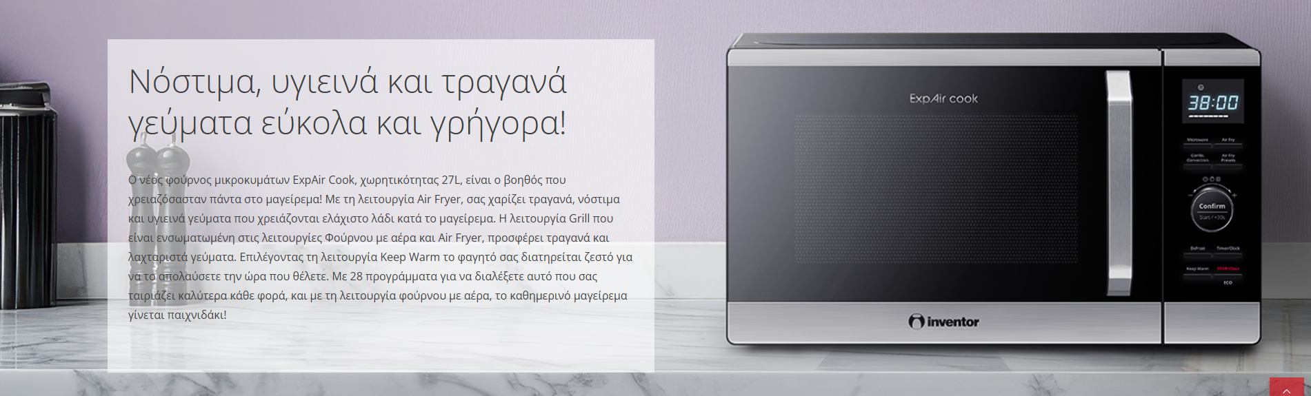 Ο νέος φούρνος μικροκυμάτων Inventor ExpAir Cook MWO-AF-27LT-BD, χωρητικότητας 27L, είναι ο βοηθός που χρειαζόσασταν πάντα στο μαγείρεμα! Με τη λειτουργία Air Fryer, σας χαρίζει τραγανά, νόστιμα και υγιεινά γεύματα που χρειάζονται ελάχιστο λάδι κατά το μαγείρεμα. Η λειτουργία Grill που είναι ενσωματωμένη στις λειτουργίες Φούρνου με αέρα και Air Fryer, προσφέρει τραγανά και λαχταριστά γεύματα. Επιλέγοντας τη λειτουργία Κeep Warm το φαγητό σας διατηρείται ζεστό για να το απολαύσετε την ώρα που θέλετε. Με 28 προγράμματα για να διαλέξετε αυτό που σας ταιριάζει καλύτερα κάθε φορά, και με τη λειτουργία φούρνου με αέρα, το καθημερινό μαγείρεμα γίνεται παιχνιδάκι!