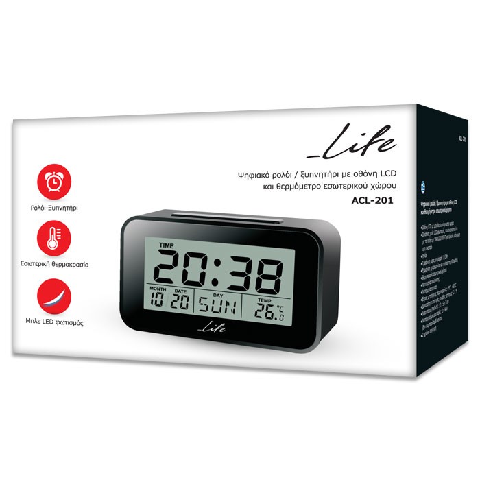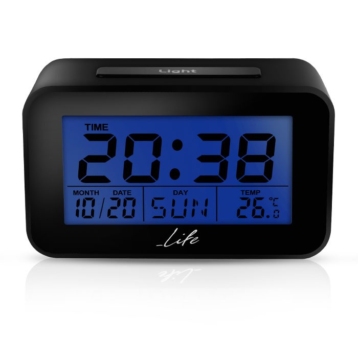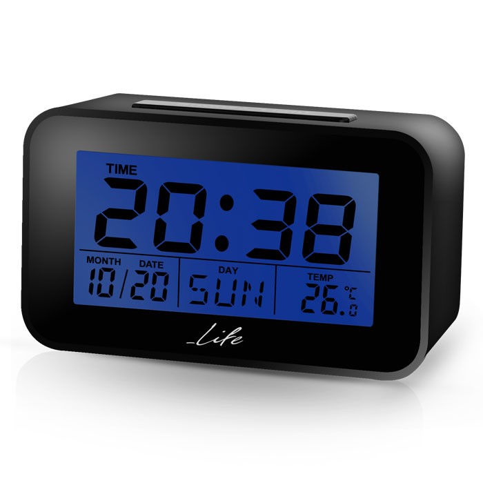 Ψηφιακό ρολόι/ξυπνητήρι με μοντέρνο design, μεγάλη ψηφιακή οθόνη και οπίσθιο μπλε LED φωτισμό . Διαθέτει ένδειξη ημερομηνίας και ημέρας της εβδομάδας καθώς επίσης και θερμοκρασία εσωτερικού χώρου. Με minimal σχεδίαση σε μαύρο χρώμα, είναι ιδανικό για κάθε χώρο.