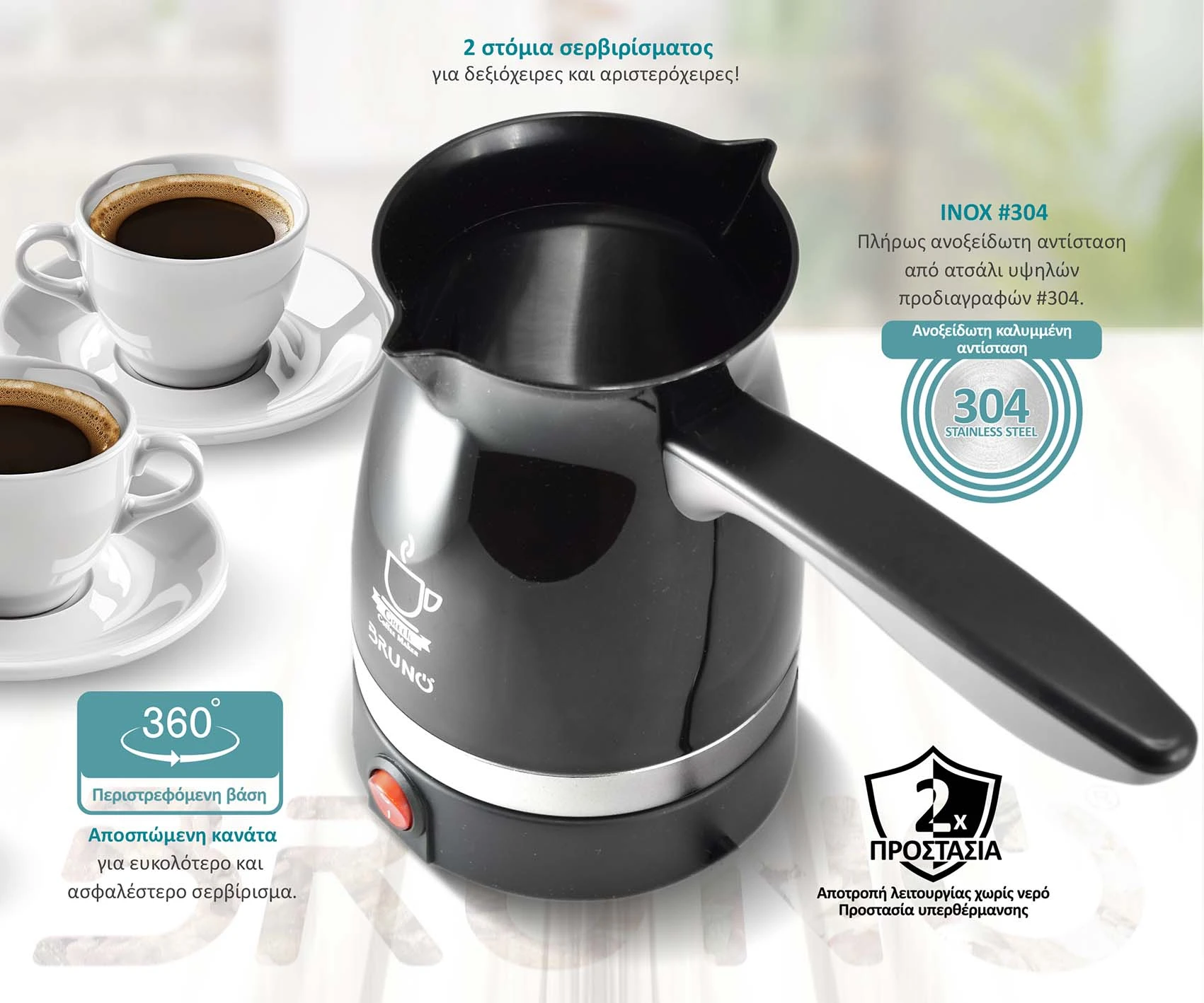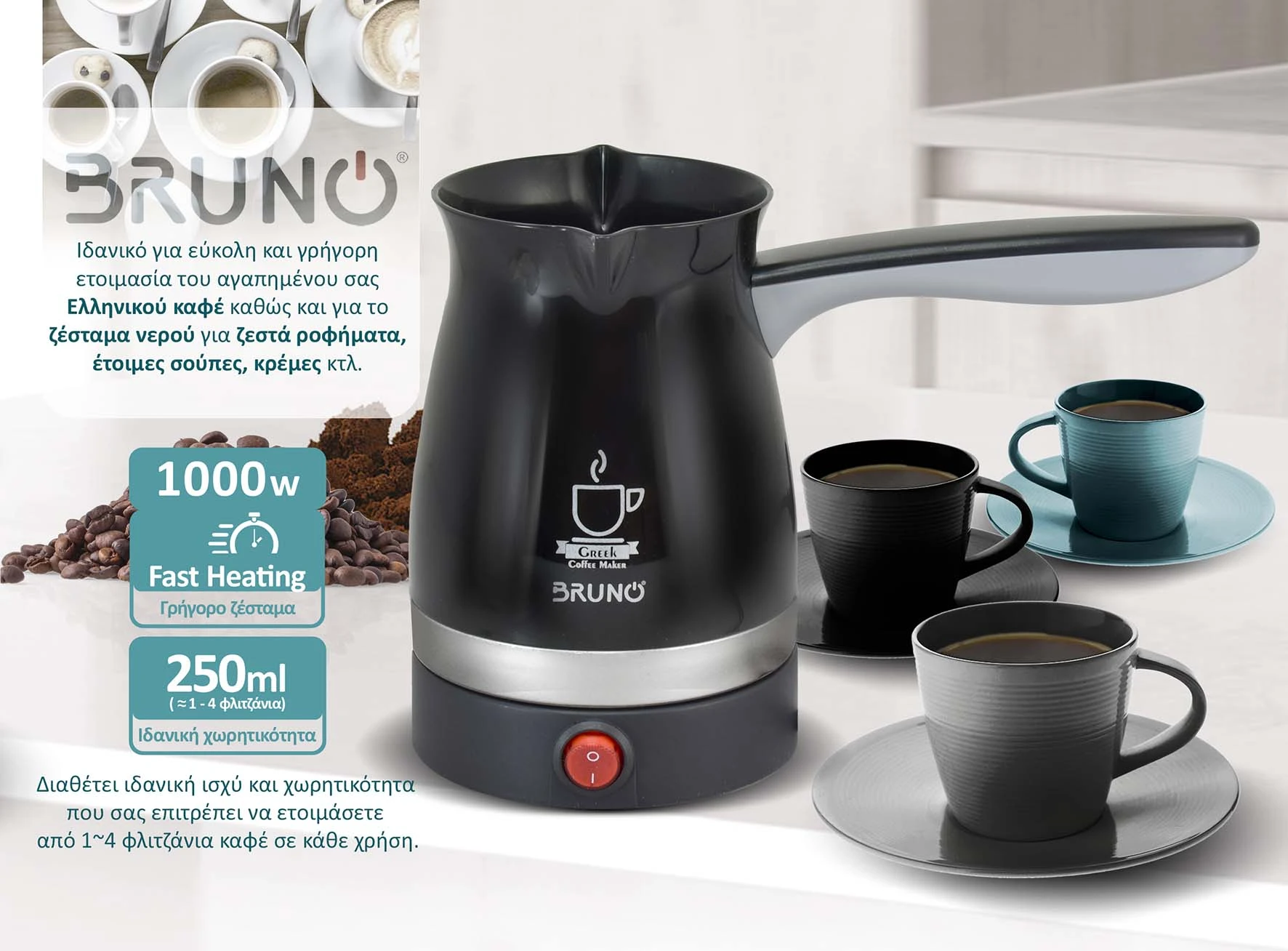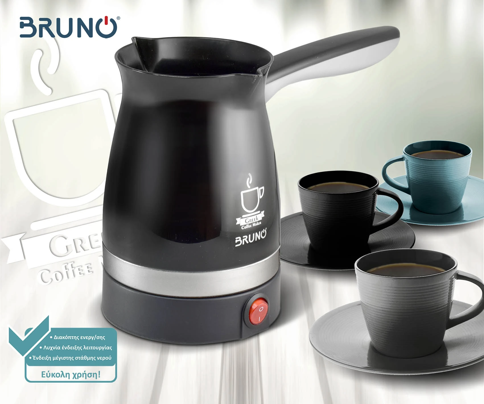 - Βασικές Λειτουργίες: Παρασκευή Ελληνικού καφέ, βράσιμο-ζέσταμα νερού