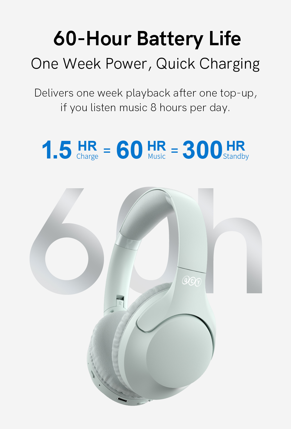 Χάρη στη διάρκεια ζωής της μπαταρίας έως και 60 ώρες, το QCY H2 προσφέρει αναπαραγωγή μιας εβδομάδας μετά από μία φόρτιση, αν ακούτε μουσική 8 ώρες την ημέρα.