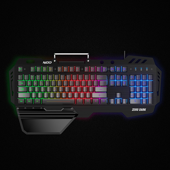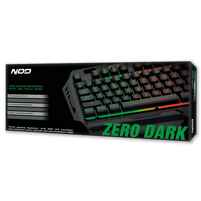 Ενσύρματο gaming πληκτρολόγιο με RGB LED οπίσθιο φωτισμό, μαύρη επιφάνεια από αλουμίνιο, μεγάλο palm rest και βάση στήριξης για το κινητό. Το νέο πληκτρολόγιο της NOD, ZERO DARK, είναι ο απόλυτος σύμμαχός σου σε κάθε πεδίο μάχης. Το ενσύρματο gaming πληκτρολόγιο ZERO DARK έχει εντυπωσιακή, total black εμφάνιση με επιφάνεια από βαμένο μαύρο αλουμίνιο και ταυτόχρονα εργονομική σχεδίαση για πολύωρη χρήση. Επιπλέον διαθέτει XL αποσπώμενη επιφάνεια στήριξης καρπού που του προσδίδει aggressive εμφάνιση καθώς και βάση στήριξης για το smartphone σου για να είναι πάντα στο οπτικό σου πεδίο. Διαθέτει οπίσθιο Rainbow RGB LED φωτισμό, 3 διαφορετικά επίπεδα φωτεινότητας και 2 συνδυασμούς φωτισμού για να επιλέγετε ανάλογα με την διάθεση σας! Το μαύρο braided USB καλώδιο μήκους 1,5μ, συμπληρώνει ιδανικά την εμφάνισή του και εγγυάται την εξαιρετική αντοχή του στον χρόνο. Επιπλέον, για υψηλές gaming επιδόσεις σου δίνει την δυνατότητα για 19-key rollover, ενώ διαθέτει και 12 πλήκτρα για multimedia & office εφαρμογές!