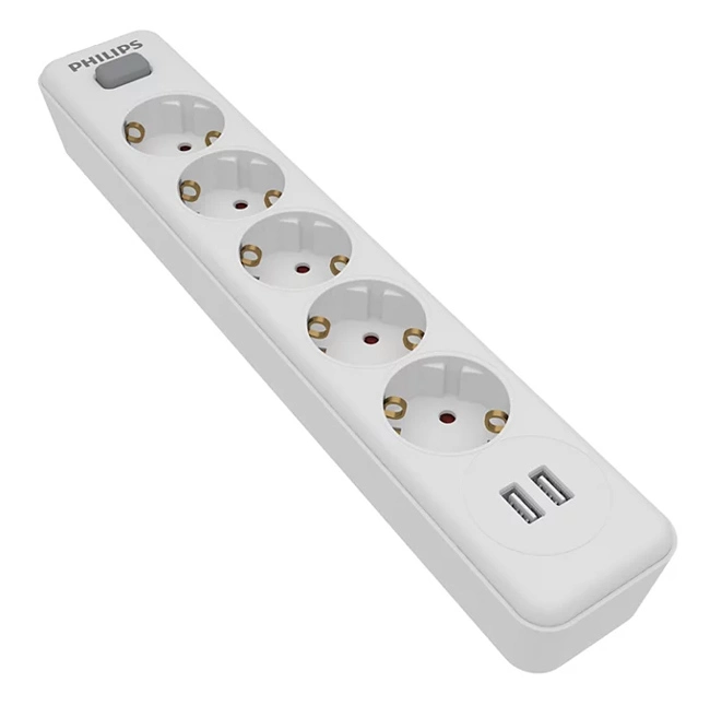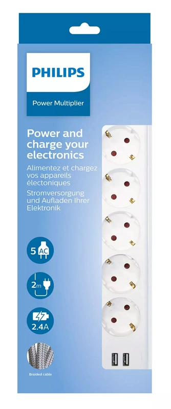 Πολύπριζο ρεύματος της Philips με 5 πρίζες schuko για την τροφοδοσία των ηλεκτρικών σας συσκευών και 2 θύρες φόρτισης USB, για την φόρτιση συσκευών που φορτίζουν μέσω θύρας USB. Διαθέτει ανθεκτικό braided καλώδιο τροφοδοσίας, διακόπτη on/off και ενσωματωμένη παιδική ασφάλεια.