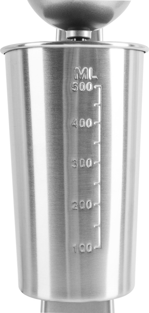 Διαθέτει κύπελλο ανάμειξης 500ml κατάλληλο για ροφήματα αλλά και για χτύπημα κρέμας, dressing κλπ. με ενδείξεις για μέτρηση ποσότητας υγρών.