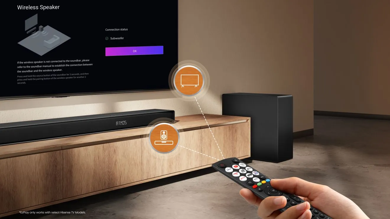 Ελέγξτε εύκολα τη soundbar απευθείας από το τηλεχειριστήριο της Hisense TV και δείτε τις ρυθμίσεις ήχου σε πραγματικό χρόνο στην οθόνη.