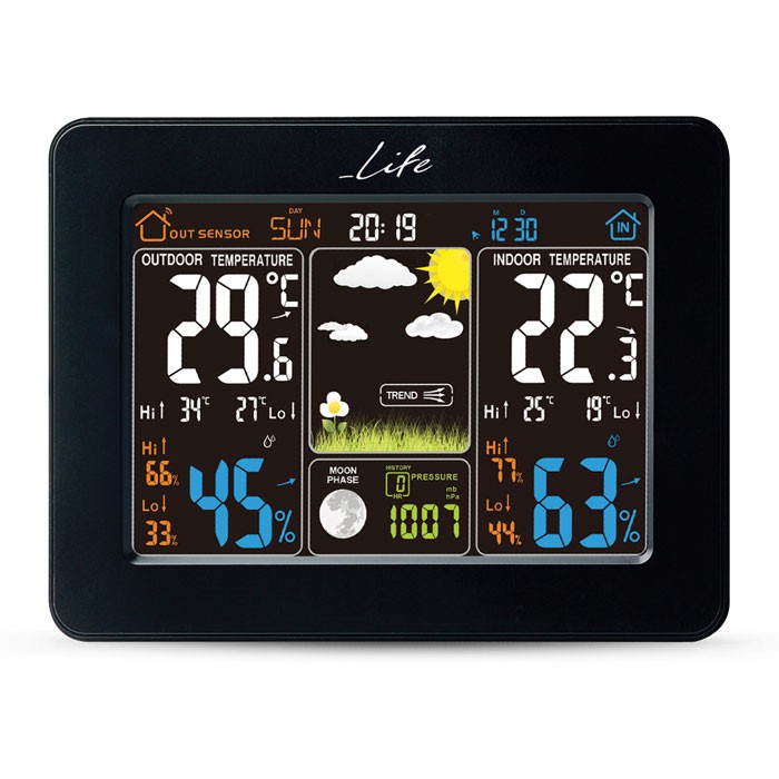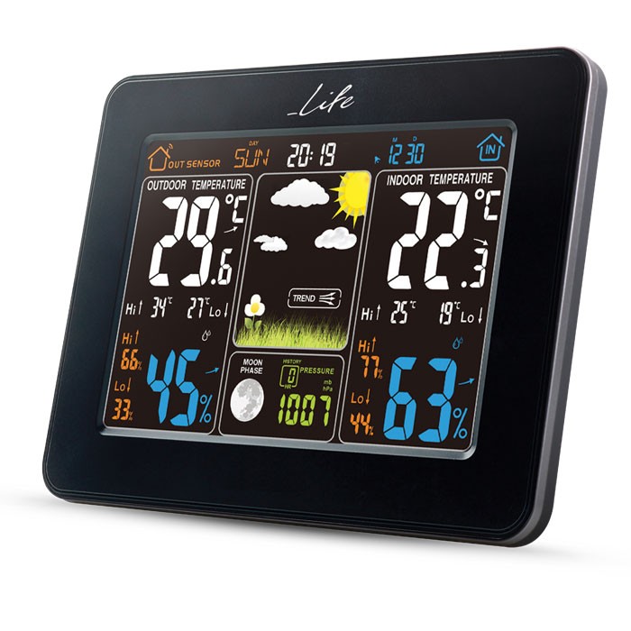 Μετεωρολογικός σταθμός με μεγάλη, έγχρωμη ψηφιακή LCD οθόνη 5.7″, οπίσθιο φωτισμό LED και ασύρματο εξωτερικό αισθητήρα για πλήρη ενημέρωση των καιρικών συνθηκών στην περιοχή σας. Με design σε απλές γραμμές, ασημί διακριτικές λεπτομέρειες και οθόνη εντυπωσιακών χρωμάτων είναι κατάλληλο για κάθε χώρο, ενώ παράλληλα η λειτουργία ρολογιού / ξυπνητηριού το κάνει σχεδόν απαραίτητο στην κρεβατοκάμαρά σας. Προβάλλει την θερμοκρασία εσωτερικού και εξωτερικού χώρου, την υγρασία εσωτερικού και εξωτερικού χώρου καθώς και την βαρομετρική πίεση των τελευταίων 12 ωρών. Επιπλέον, διαθέτει ένδειξη ημερήσιας υψηλότερης/χαμηλότερης θερμοκρασίας, πρόβλεψη καιρού με απεικόνιση, ένδειξη ημερομηνίας, ώρας και ένδειξη σεληνιακής φάσης. Τέλος, η εσωτερική μονάδα λειτουργεί με το συμπεριλαμβανόμενο τροφοδοτικό ή με μπαταρίες (δεν συμπεριλαμβάνονται) και έχει ενσωματωμένο stand για επιτραπέζια τοποθέτηση.